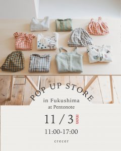 11月 3日(mon)11:00-17:00 POP UP STOREを福島市のpentonoteさんで開催します。 ※喜多方の店舗はお休みになります 秋冬服をたくさんお持ちして開催します! この機会にぜひご来店ください! Posted on 2025年5月22日2025年10月15日 by user